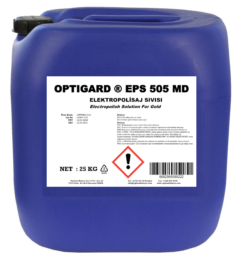 OPTIGARD ® EPS 505 MD, elektro polisaj parlatma sıvısı, 10K-24K altın, platin veya kırmızı karat altın üzerindeki siyah tabakayı gidermede sıklıkla tercih edilir.