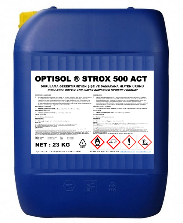 OPTISOL ® STROX 500 ACT, gıda sanayi, süt ürünleri, içecek ve gıda işleme endüstrilerinde ve aseptik işleme ve paketleme ekipmanları, ilaç, farmakoloji, biyoteknoloji, tıbbi ürün imalatı, araştırma laboratuvarlarında, kozmetik ve besin endüstrilerinde, temiz oda çevresel yüzeyleri ve ekipmanlarının sterilizasyonunda, sterilizatör, sporisit veya dezenfektan olarak güvenle kullanılan, geniş spektrumlu antimikrobiyal aktiviteye sahip, çabuk etkisini gösteren, durulama gerektirmeyen, köpüksüz sıvı dezenfektandır.